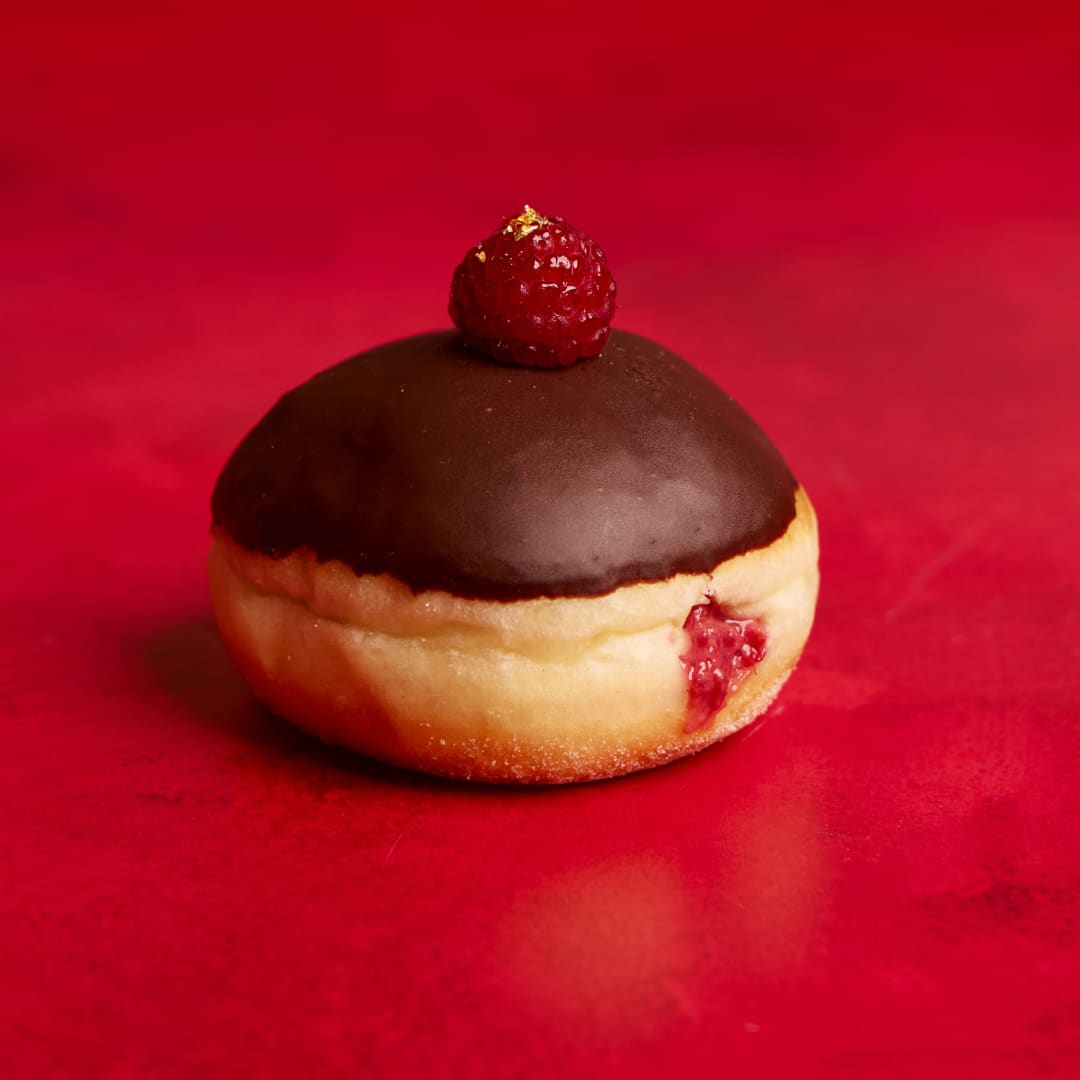 Chocolate glaze with raspberry cream, finished with a touch of edible gold for an extra-special bite.